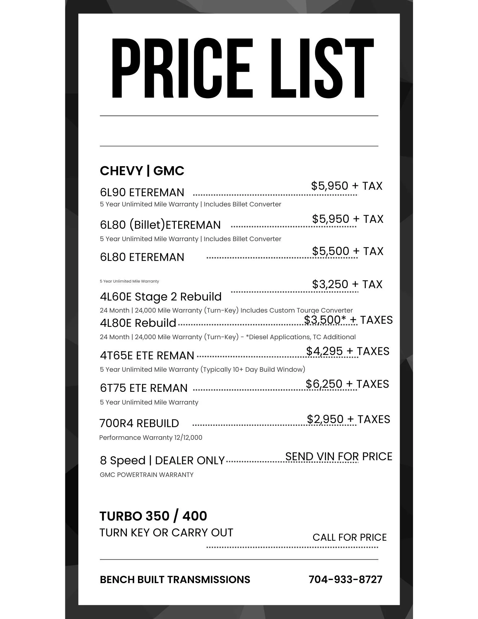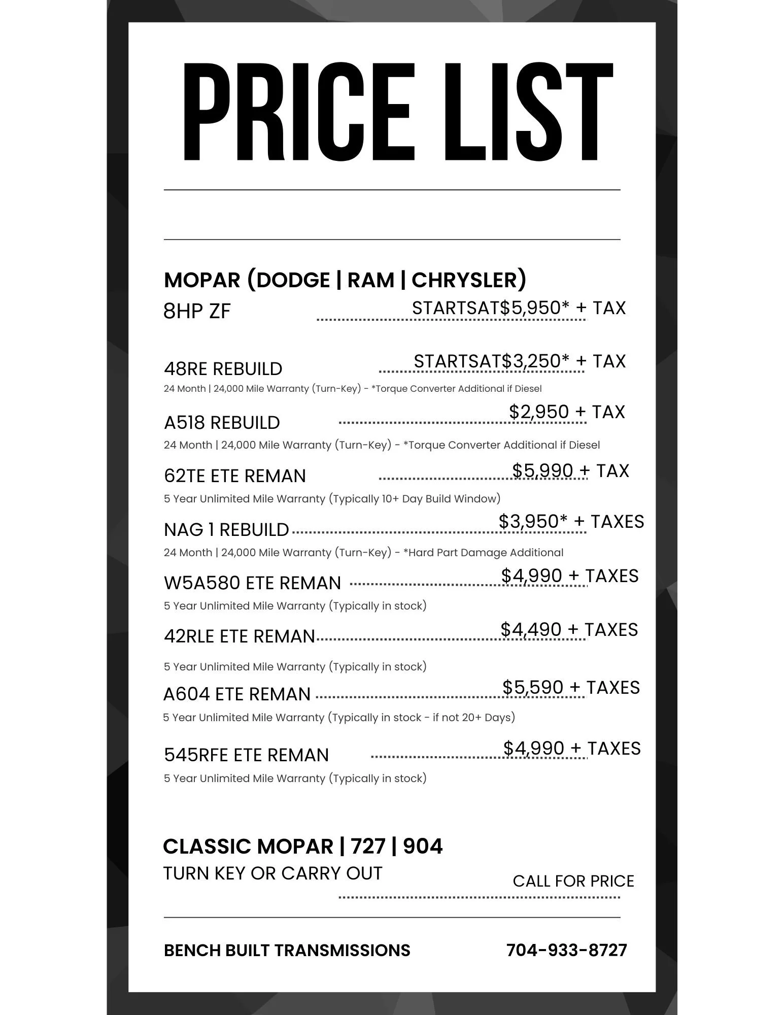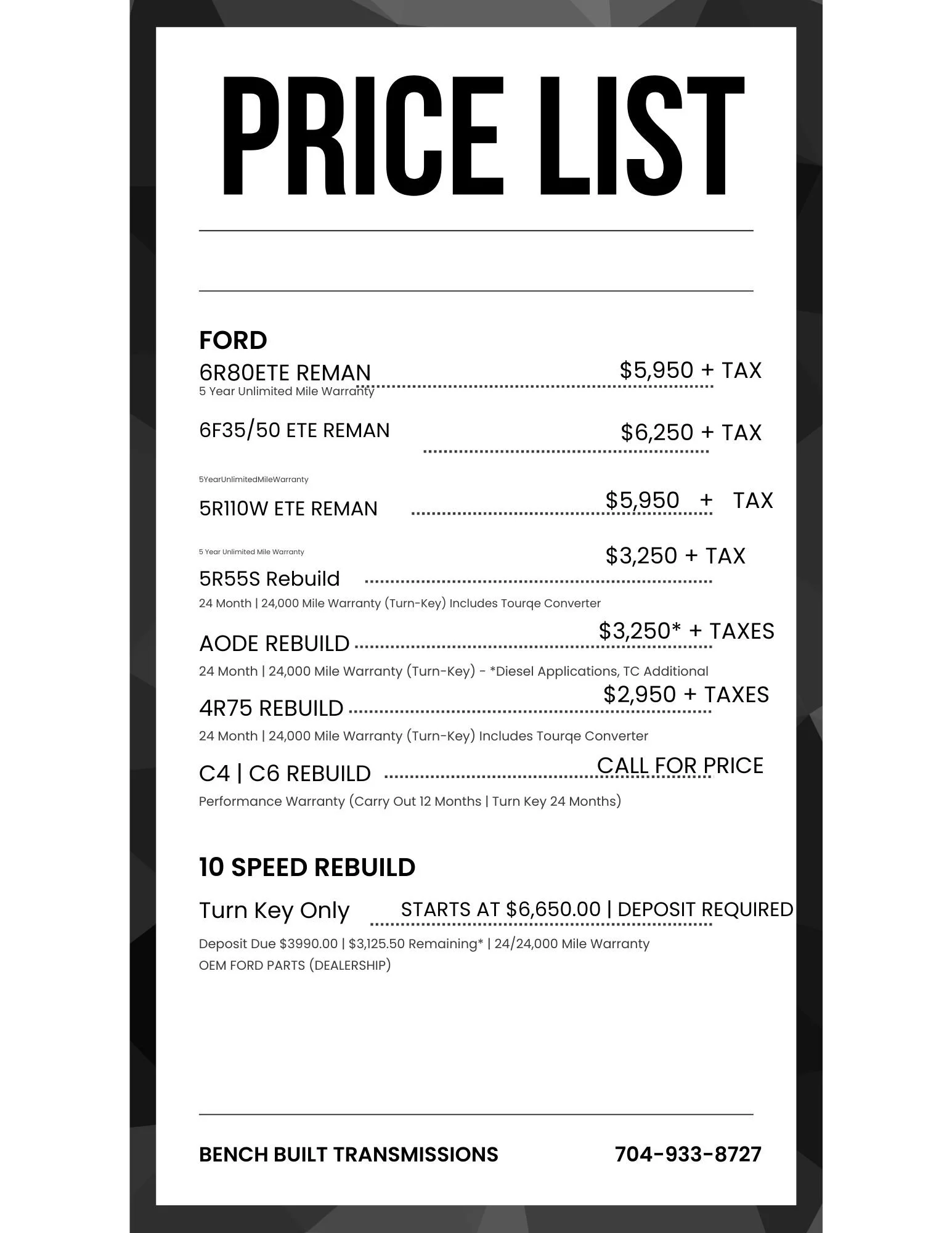 Rebuild Prices do not include any Hard Part Damage, Custom Built Torque Converter or TCM/ECM tuning. After an internal inspection - any significant hard part damage will carry additional costs. We accept Cash or Debit Card - Paying with Credit cards will add 3.5% to the bill.